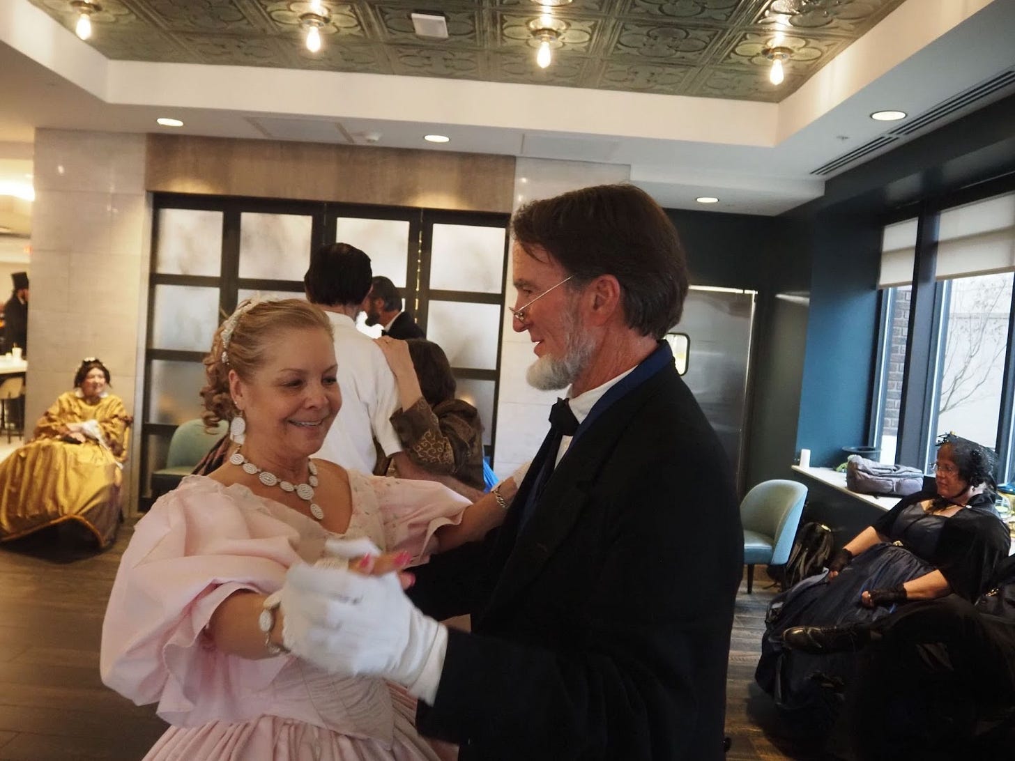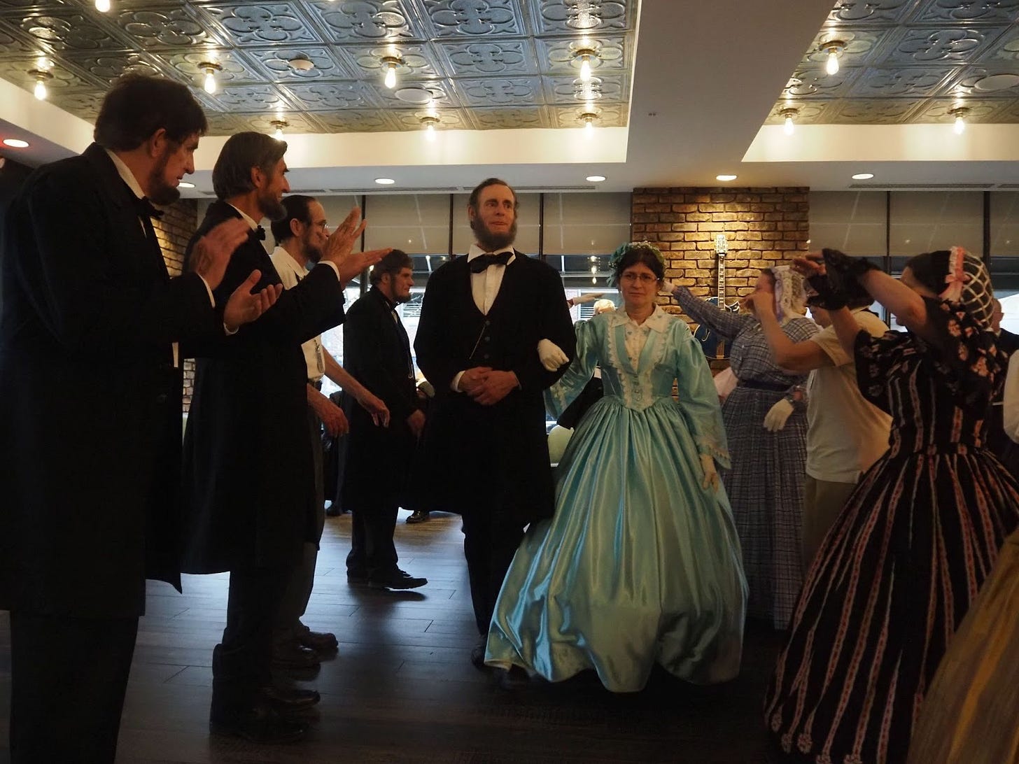 The group shoved aside the tables and chairs in the restaurant of the Hilton Garden Inn where they were staying to form a small dance floor. One of the Abes took up the role of dance caller, and led the group in slow waltzes and line dances from the 1800s. Five Marys and Abes hit the floor, while other attendees sipped white wine and smiled at the revelry from their seats. One Abe struggled to learn how to do si do during a square dance, and a Mary admonished him for almost stepping on her dress.