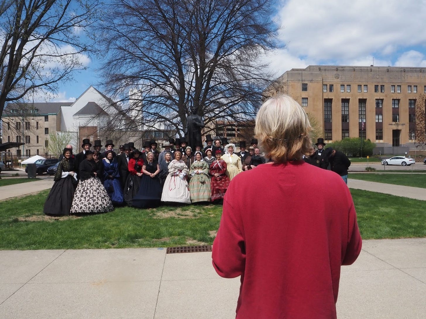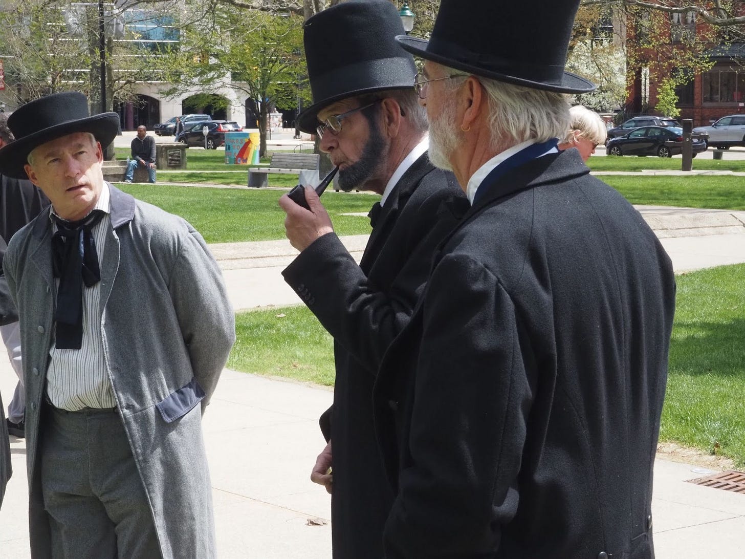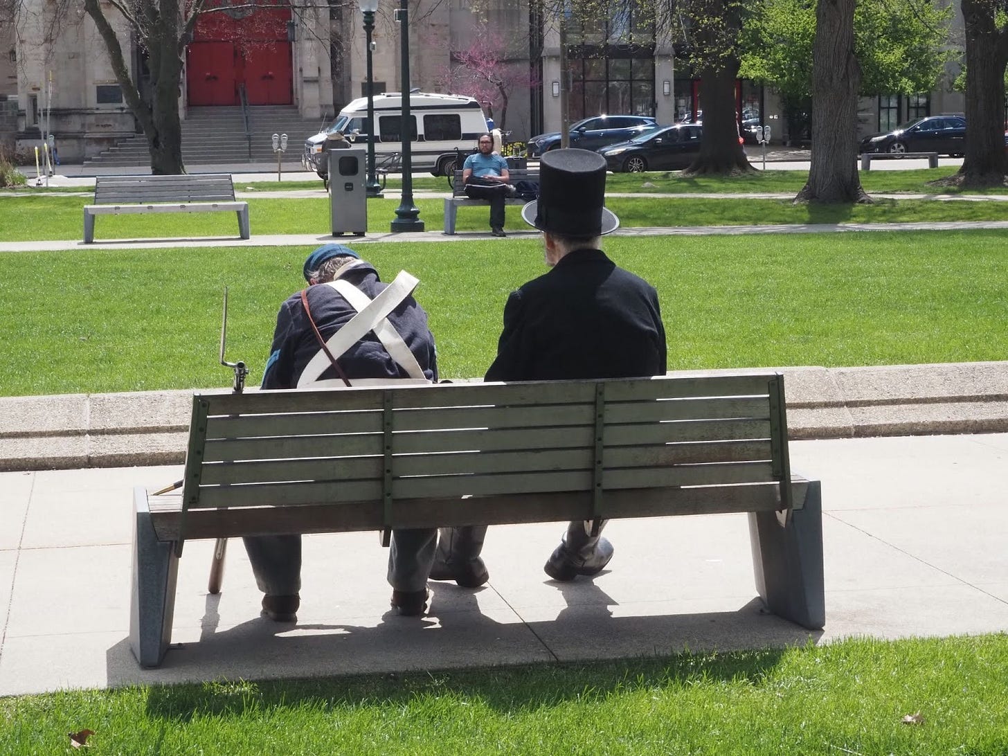 On the conference’s last day, Boggs found himself surrounded with Lincolns who had honed their craft. The Association was gathered in Kalamazoo’s Bronson Park, where Lincoln had delivered his speech for Fremont in 1856, to take their annual group photos. The gaggle of Abes started to fan out across the park as soon as they entered. One took out a pipe to smoke, while a particularly frail Lincoln sat with someone in Civil War soldier attire on a bench to rest.