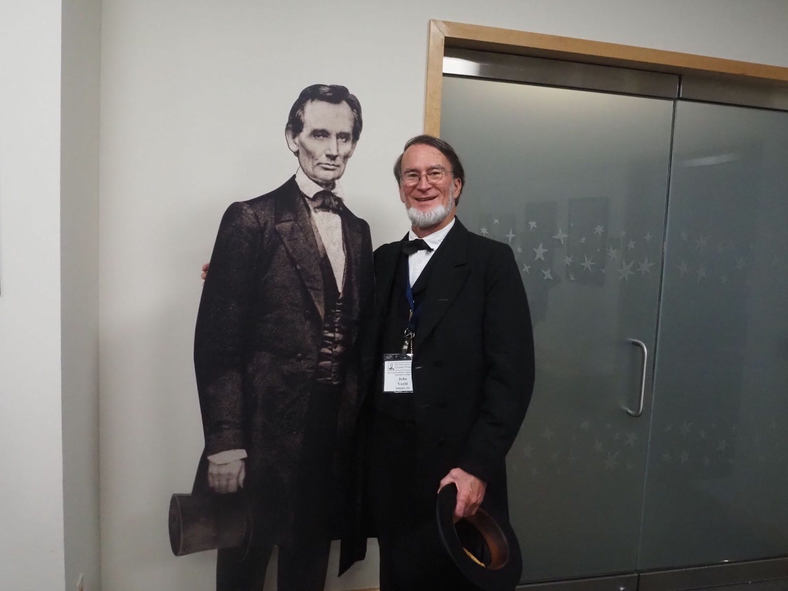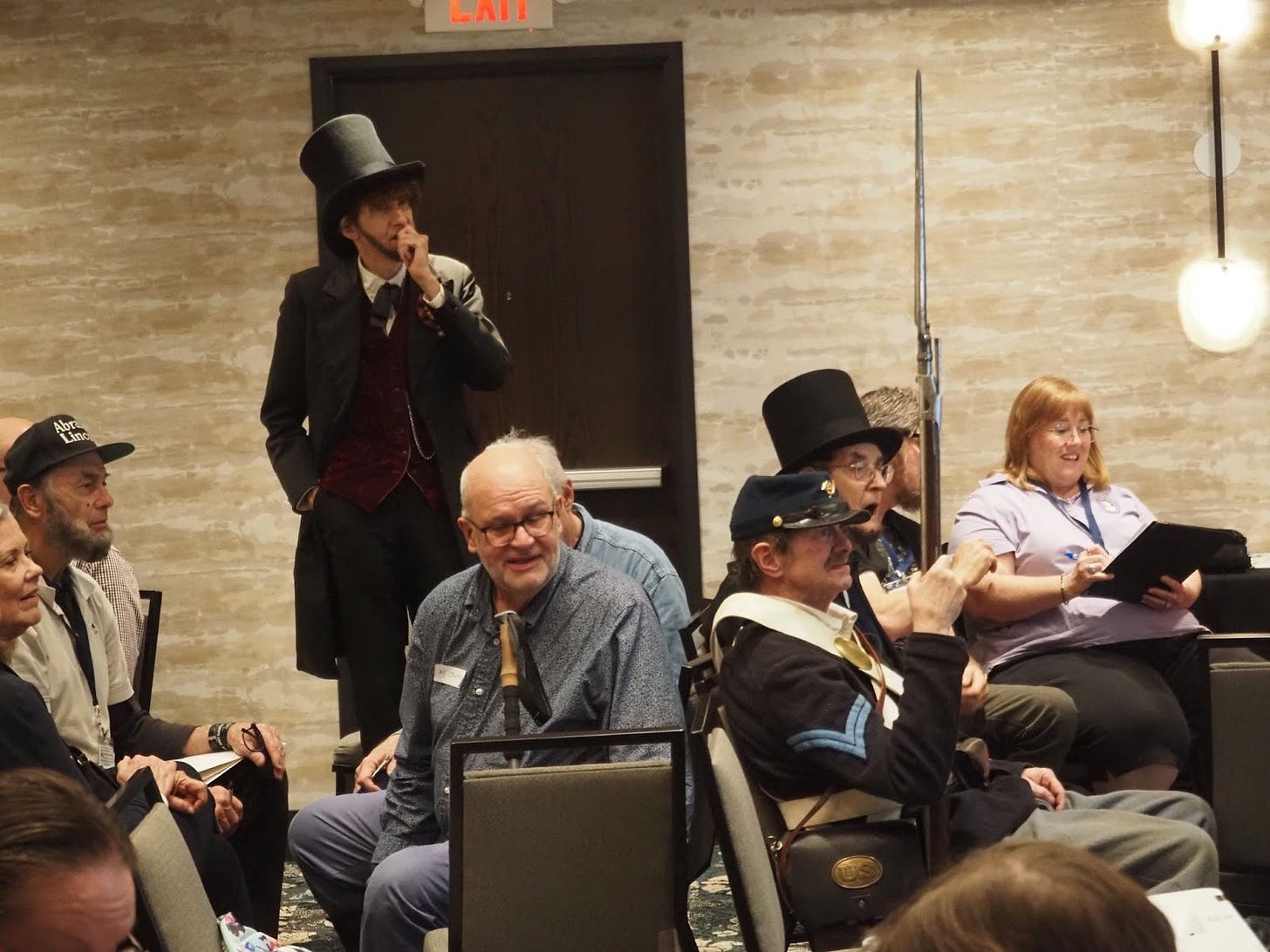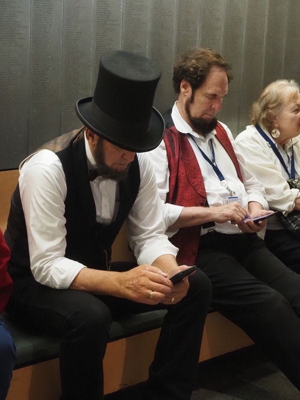 John Voehl, a Lincoln from Littleton, Colorado, sat on a bench in the corner of all this action. Voehl had taken his top hat off, and a couple sheets of weathered paper were visible inside the garment. Like Lincoln did with his papers, Voehl carries copies of the Gettysburg Address and Second Inaugural Address in his hat — purely, he hastened to say, as props. He has the speeches memorized.