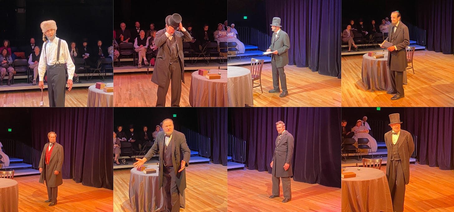 Dennis Boggs, who came out without a top hat on, covered Lincoln’s first term as president “under great and peculiar difficulties.” John Cooper then emerged from the wings playing a harmonica before delivering an emphatic performance of the Gettysburg Address. He was followed by Joseph Woodard, who recited Lincoln’s Second Inaugural Address through a deep Southern drawl. The final Lincoln, Murray Cox, explained Lincoln’s goals for his second term and the Reconstruction of the South, before saying he had to go meet Mary to get to a showing of “Our American Cousin” at Ford’s Theatre.