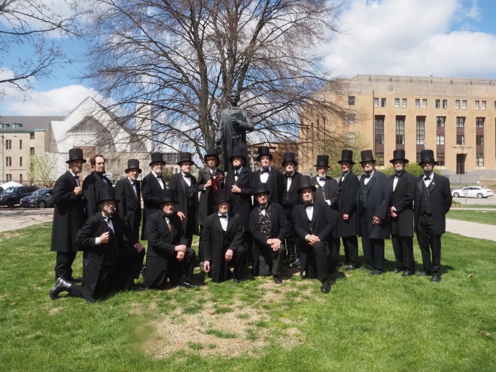 Wood called all the presenters together next to a statue of Lincoln, explaining that this was where “we” gave a speech centuries earlier. The conference’s photographer, Tom George Davison, organized the Association members around the statue based on heights — meaning the Lincolns, of course, all stood in the back.