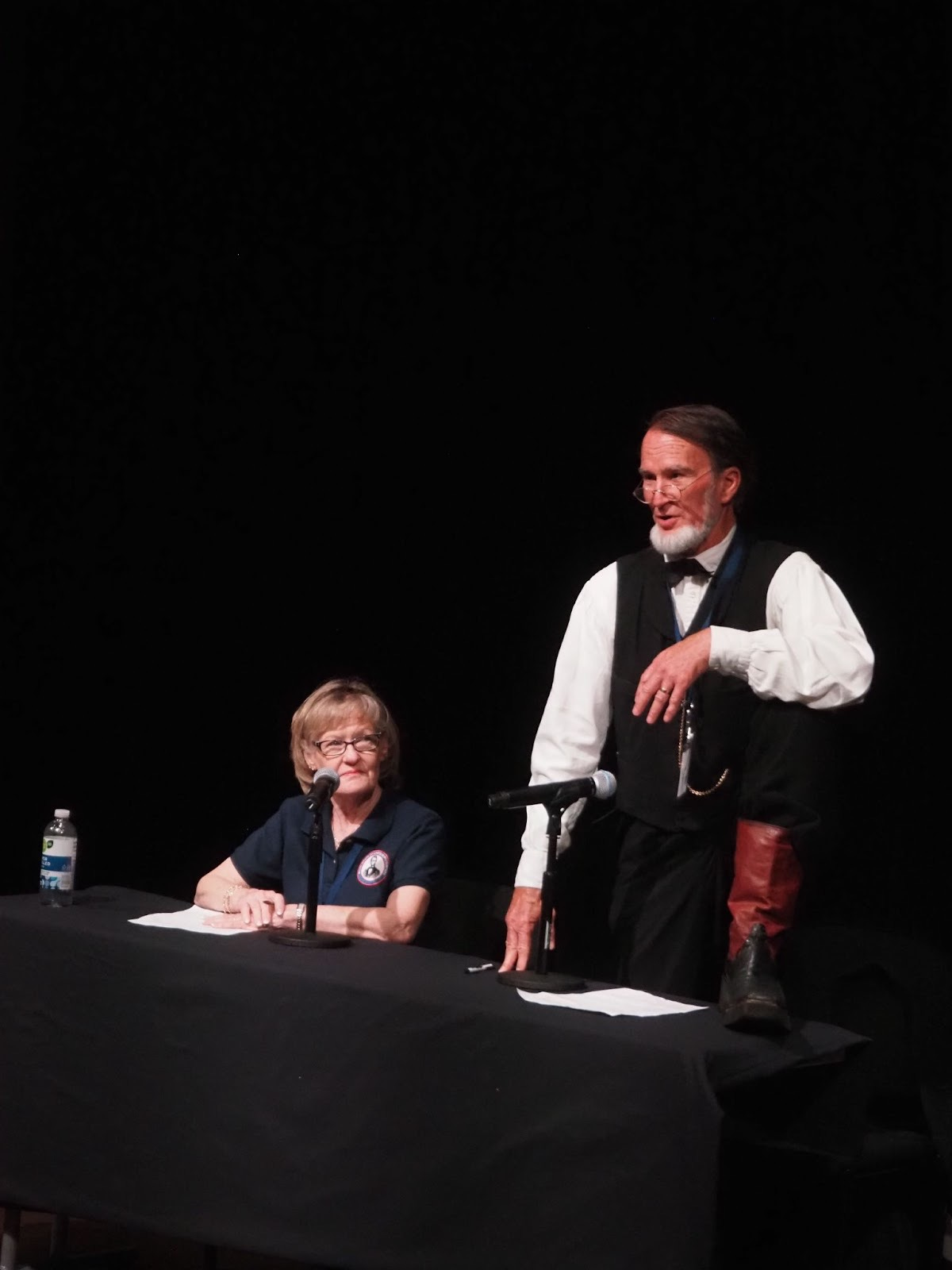 After George left the stage, Voehl went on. He was set to moderate a “bull session,” a free-ranging conversation with the other Abes about the nuts and bolts of being a Lincoln. Voehl settled at a table alongside Teena Baldridge, a Mary Lincoln presenter serving as Voehl’s co-moderator. The theater lights dimmed and a spotlight came up right on Voehl.