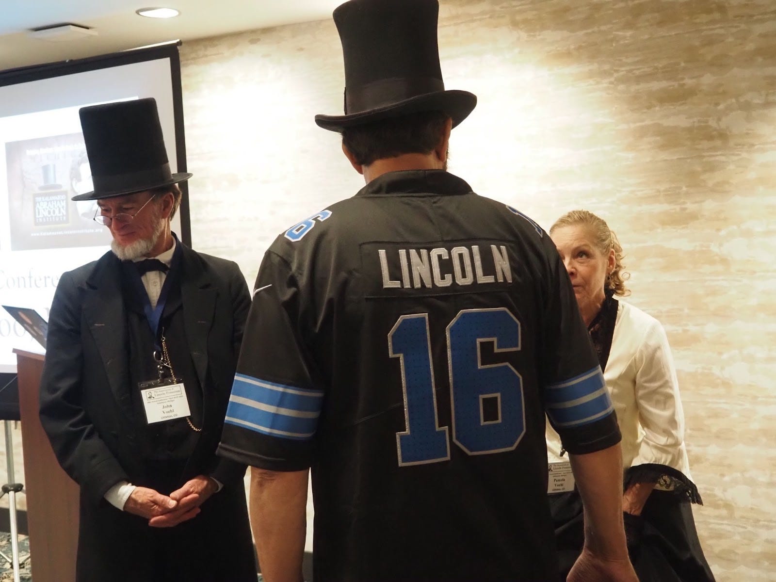 A third Lincoln, leading the trivia game, asked four more questions before revealing the answers. He reminded the room — filled with 20 other Abes — that using their “portable telegraph machine” to look up solutions would be cheating. After the leading Lincoln revealed the answer to the nickname question, the Lincoln who got the query right cheered. A Lincoln wearing a #16 Detroit Lions jersey with “Lincoln” on the back yelled out that the other Abe must have cheated. Someone wearing a baseball cap that said “Abraham Lincoln” rolled his eyes, while a Lincoln in a Hawaiian shirt sat in the back and stayed out of the chaos. A man playing Jefferson Davis, with a Southern white suit, shook his head. The Lincoln leading the trivia game tried to calm the chaos.